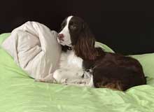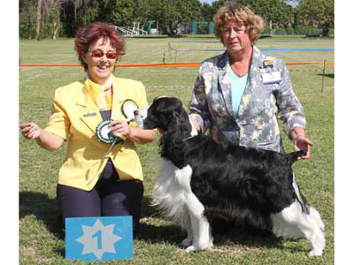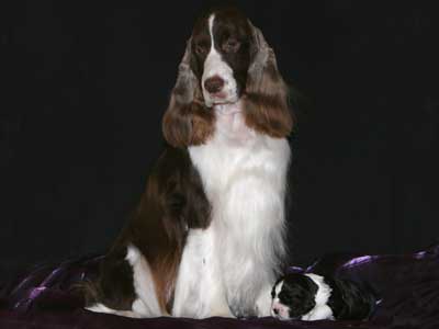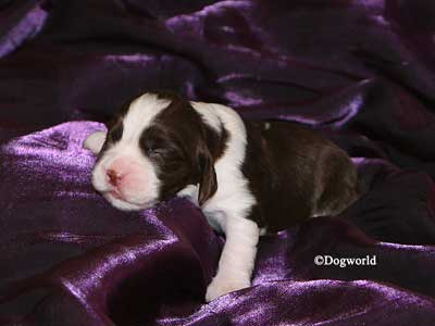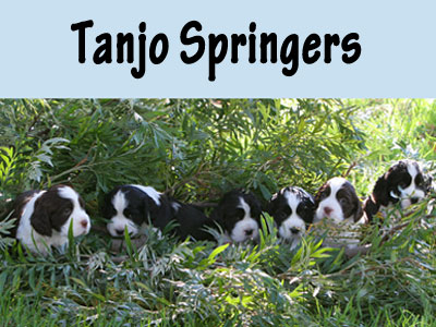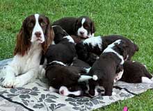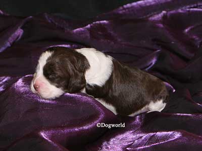 Seven stunning liver & white pups were born to Zara, Ch Paradise Wild Dreams at Tanjo JM (imp USA), and sired by Chrys, Supreme Ch Tanjo War Lord JM.